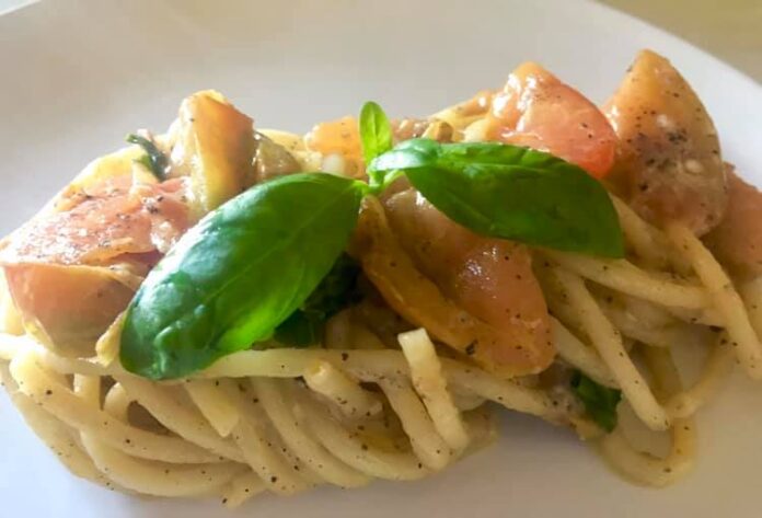 Aggiungere il basilico a foglie ai pomodori acerbi cotti, facendo in modo che si insaporisca il tutto (prestando attenzione a non far annerire il basilico) e procedere all’impiattamento aggiungendo ai bucatini alcuni cucchiai di pomodorini verdi.