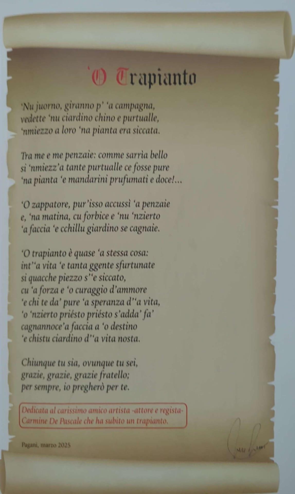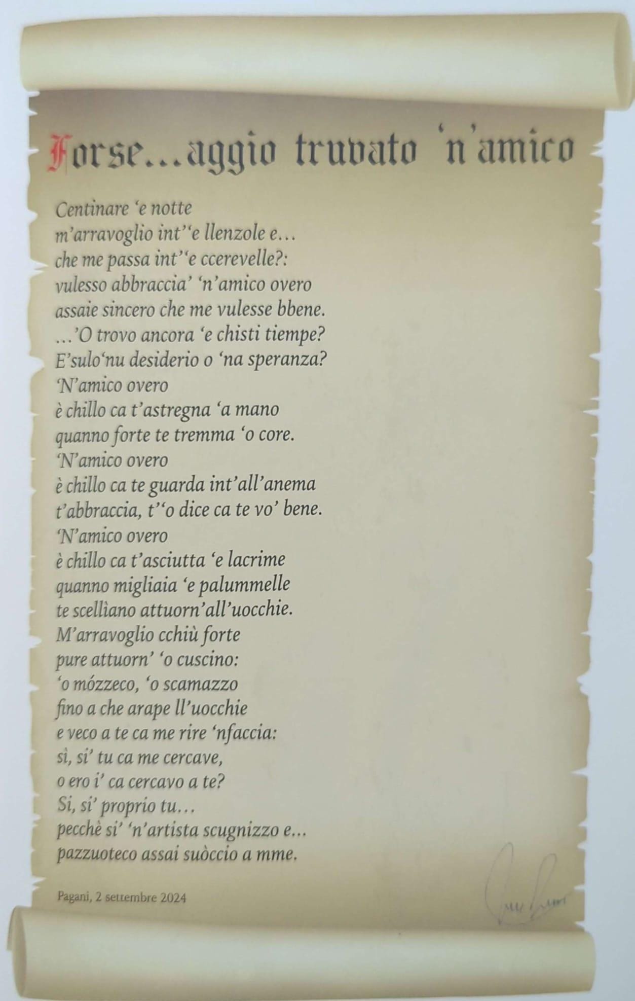 Il poeta di Pagani non smette mai di interrogare il presente, di scavare nelle contraddizioni di una società spesso spietata, riportando nella sua scrittura frammenti di memoria, incontri, addii. Commovente il ricordo di un amico sottoposto a trapianto, narrato con la forza di chi ha imparato a misurare il respiro del verso con quello della natura. E ancora, le liriche dedicate alla festa della mamma e del papà, poi ritrae un terreno fertile di riflessione, dove il ricordo di chi non c’è più lascia non ricchezze materiali, ma segni di valore, gesti e azioni che hanno marcato la comunità.