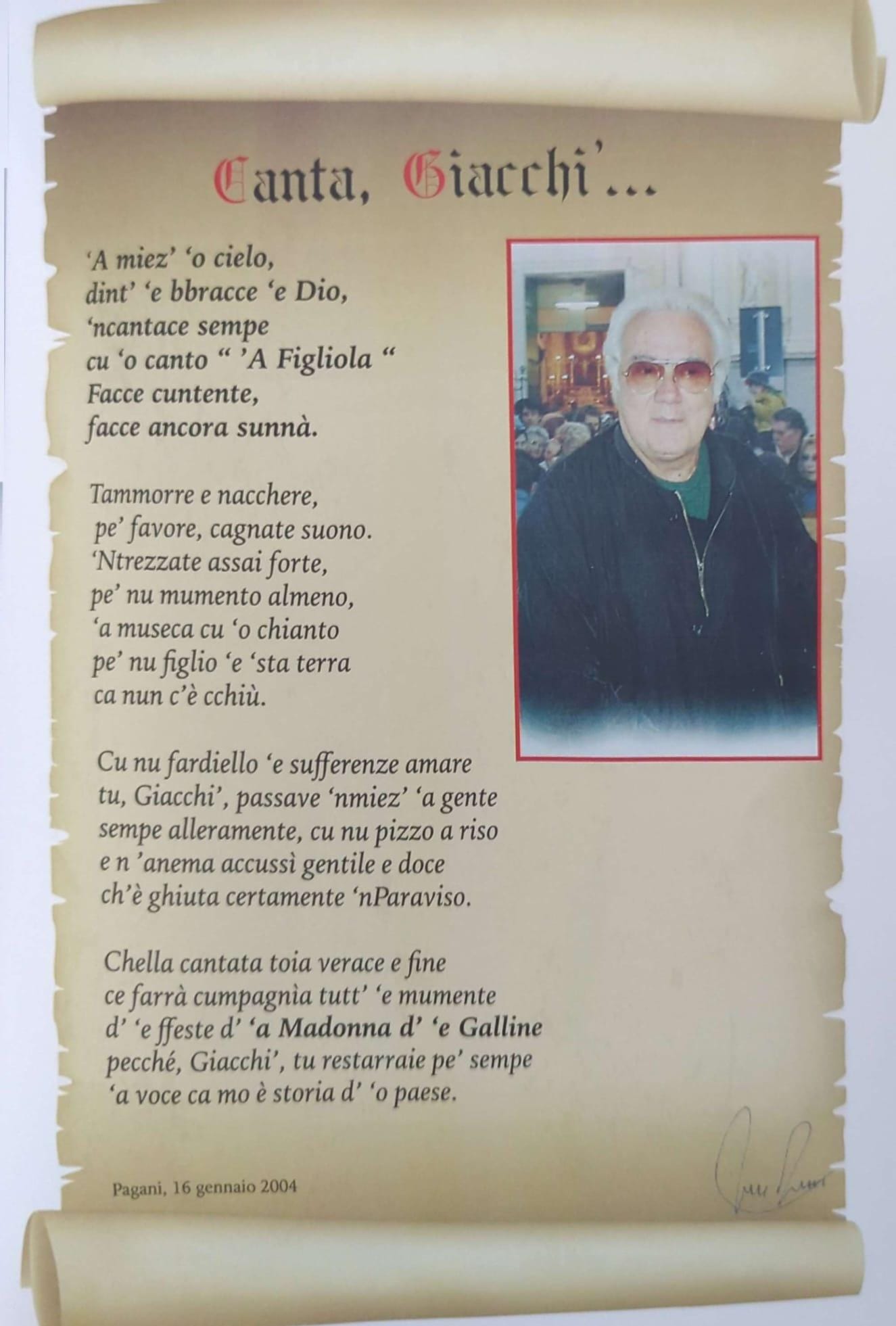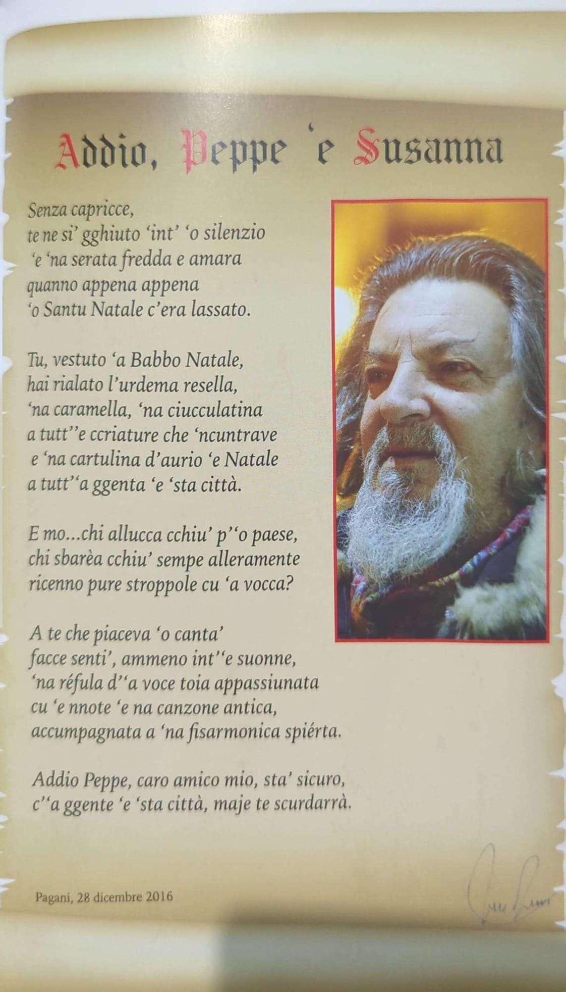 Particolarmente toccante la lirica, intrisa di sentimenti, alla moglie, che precede il suo “‘O testamiento p”a famiglia”, dal sapore quasi pirandelliano. Qui il poeta si affida al futuro, chiedendo di essere ricordato dai suoi cari non per ciò che ha posseduto, ma per ciò che ha raccontato. È l’eredità di un uomo che ha saputo trasformare l’esistenza in poesia, lasciando una luce che non si spegne con il tempo.