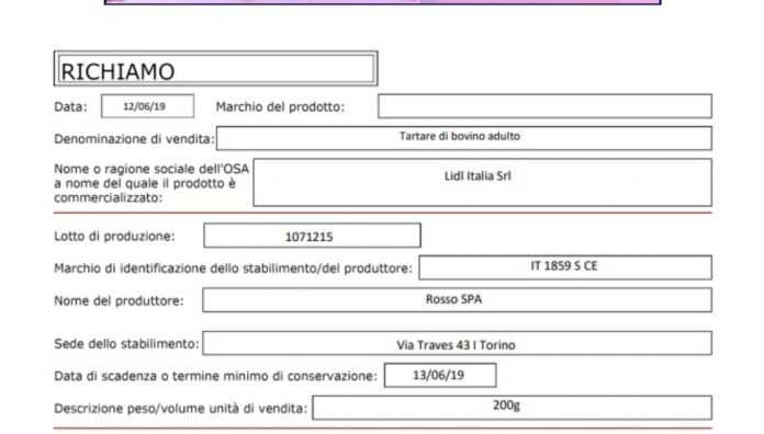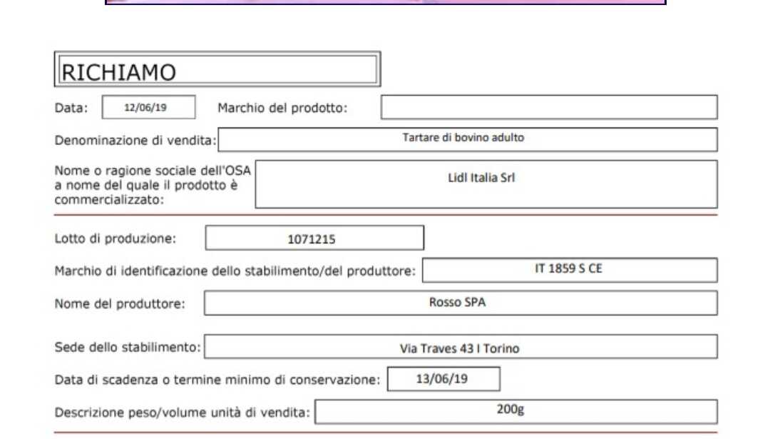 Il primo richiamo riguarda la tartare di bovino adulto commercializzata da Lidl e prodotta da Rosso Spa presso lo stabilimento di Via Traves 43 a Torino. In questo caso, il lotto ritirato è il n° 1071215 nel formato da 200 grammi con data di scadenza 13/06/19.