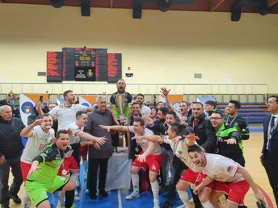 L’ASD Sporting Sala Consilina C5 alza la Coppa Italia Calcio a Cinque C1 al Palacoscioni di Nocera Inferiore e vola alla fase nazionale. La squadra salernitana si è aggiudicata la vittoria ai tempi supplementari per 6 -4 contro un brillante Futsal Coast. Un tripudio di gioia per la famiglia del calcio a Cinque regionale.