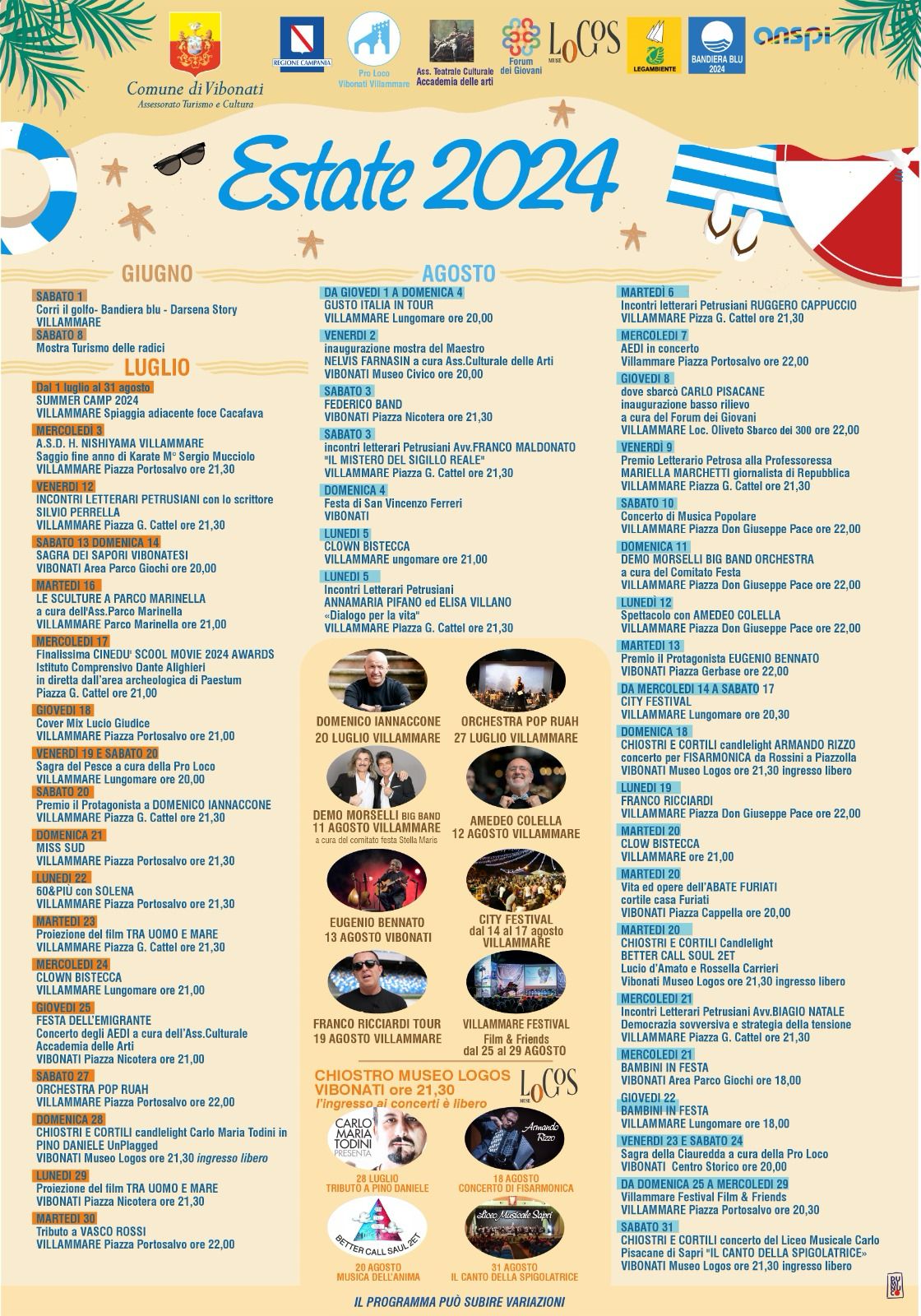 È proprio l’assessore Brusco ad aver promosso il tabellone dell’estate 2024, supportato dal sindaco Manuel Borrelli e da Vincenzo Cernicchiaro, occupandosi della parte culturale. Il tabellone estivo presenta tanti eventi diversi tra loro e inseriti in diverse località di Vibonati e Villammare, quale frazione di Vibonati. L’obiettivo da parte dell’amministrazione è di far conoscere ai cittadini e ai turisti le bellezze paesaggistiche, territoriali, gastronomiche, storiche e culturali che offre il territorio.