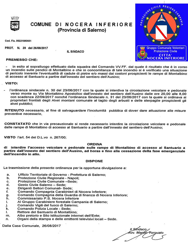 Niente auto e moto sulle rampe che portano al santuario di Montalbino: l’ha deciso con ordinanza il primo cittadino di Nocera Inferiore Manlio Torquato. L’ordinanza resterà in vigore fino a cessato pericolo causato dalle fiamme che da ieri sera circondano le montagne nocerine.