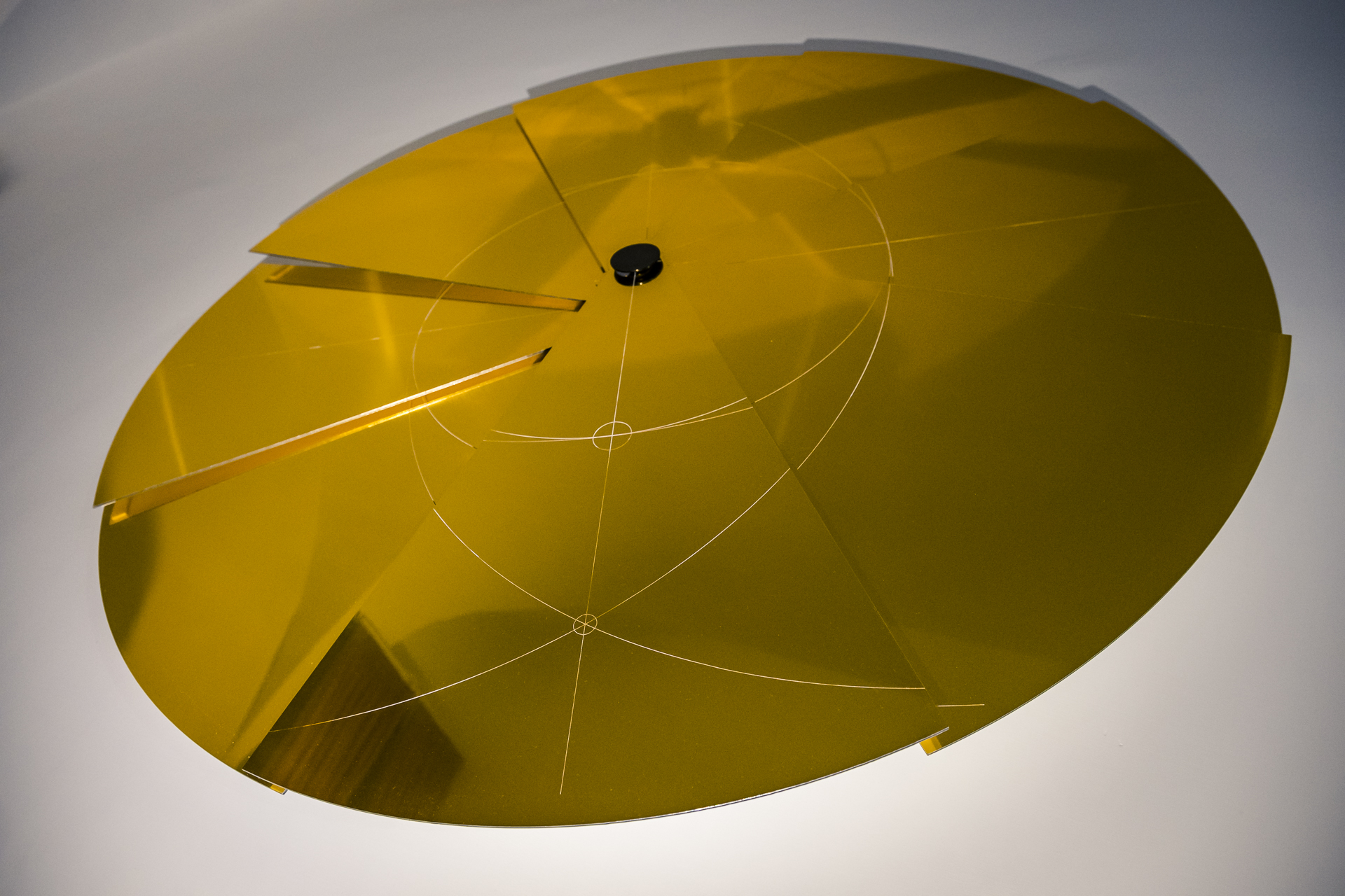 «Nell’opera La vanità dell’universo geometrico, il riferimento alla fisica è chiaro: essa viene interpretata come la scienza che studia i fenomeni naturali, analizzando le leggi fondamentali e le interazioni tra materia ed energia. La fisica descrive e prevede il comportamento dell’universo, dalle particelle subatomiche fino alle grandi strutture cosmiche. Il cerchio, la figura geometrica più semplice e pura, rappresenta simbolicamente il ciclo naturale della vita, in cui nascita, morte e rinascita si fondono in una forma continua. Priva di spigoli e angoli, questa forma trasmette concetti di armonia, unità e connessione universale. L’opera è caratterizzata da una costruzione complessa di cerchi concentrici, che suggeriscono la connessione tra mondi diversi. La superficie specchiante, invece, imprigiona lo spettatore all’interno dei confini dell’opera, dove linee e forme regolano il passaggio. Questo specchio invita a riflettere sull’equilibrio e la sovranità dell’universo, ma al tempo stesso evoca un nuovo sole, simbolo di altre vite possibili in luoghi lontani dell’universo. Non siamo soli».