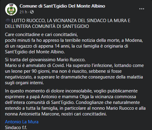 “Care concittadine e cari concittadini, ho appreso la terribile notizia della morte, a Modena, di un ragazzo di appena 14 anni, la cui famiglia è originaria di Sant’Egidio del Monte Albino.