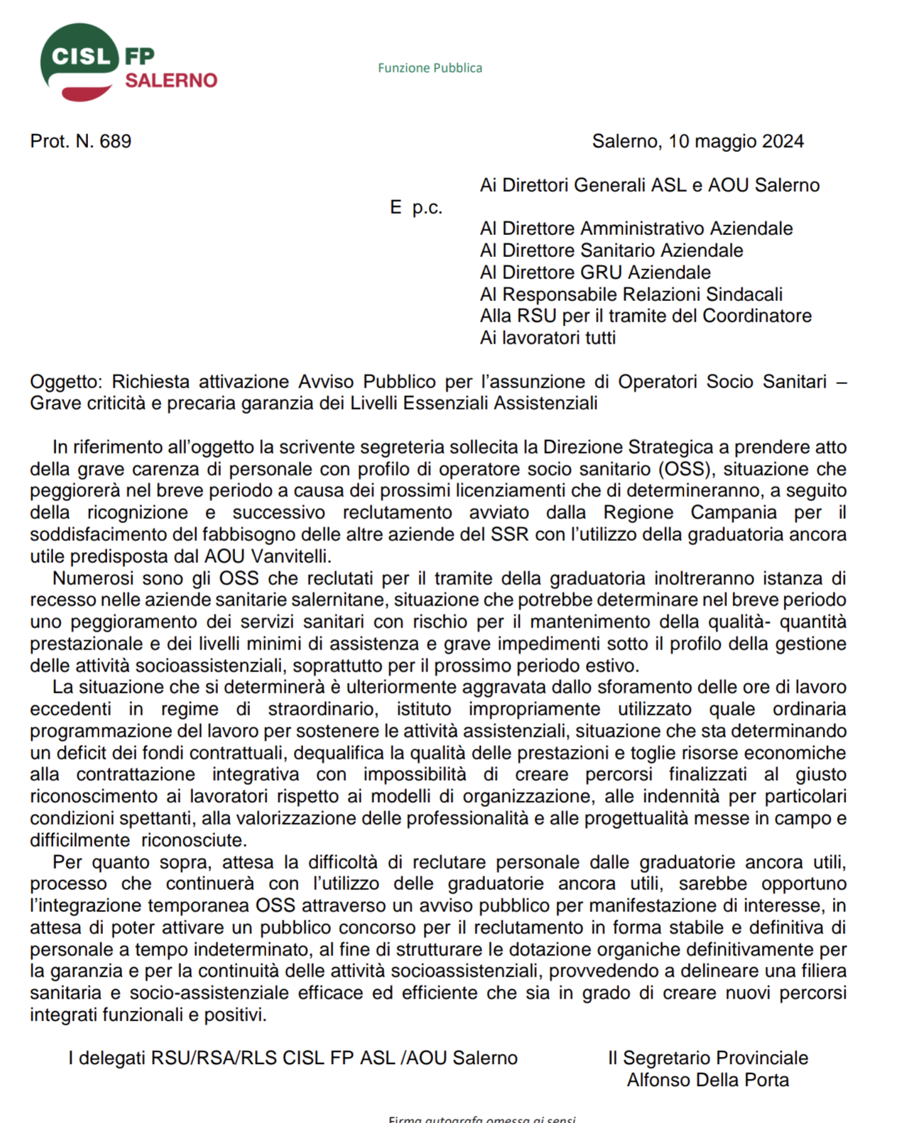 “Bisogna prendere atto, continua Della Porta, che sono pochi gli operatori salernitani inseriti nelle graduatorie attualmente ancora vigenti per essere utilizzate, questo determina un mancato apporto per risolvere le carenze di organico non più sopportabili: sarebbe opportuno, nelle more di un concorso a tempo indeterminato per il profilo specifico, un avviso pubblico di manifestazione di interesse per reclutamenti di Oss a tempo determinato per garantire al meglio le attività socioassistenziali soprattutto nel periodo estivo. Tale necessità è relativa anche ad altre figure professionali quali gli infermieri”.