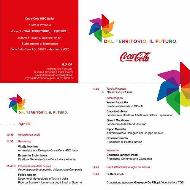 La Coca Cola, una delle bevande più amate dagli italiani dal 1927, viene prodotta a Marcianise da oltre 40 anni. In occasione dell’inaugurazione dell’impianto di cogenerazione, verrà celebrato il forte legame dell’azienda con il territorio durante l’evento “Dal territorio, il futuro” che evidenzierà le eccellenze del territorio campano in ambito industriale, ambientale, artistico e sociale.