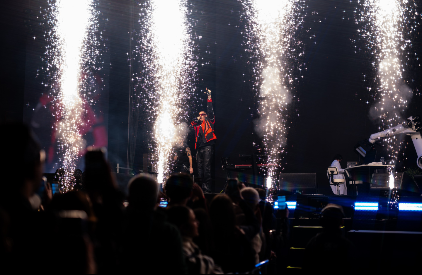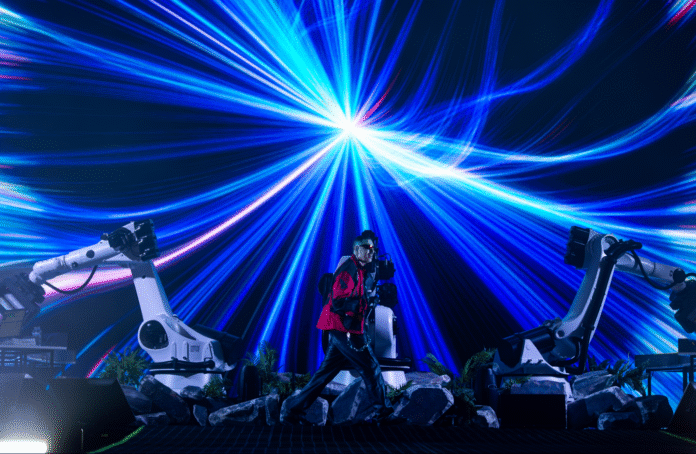 Lo show, pensato come un concept diviso in sei capitoli, racconta — attraverso scenografie immersive, braccia robotiche, un grande occhio che muta forma come simbolo del controllo contemporaneo, effetti speciali e un corpo di ballo magnetico — il conflitto tra “Fabio”, l’uomo reale stampato sulla maglia del cantante, e “Marracash”, la creatura artistica.