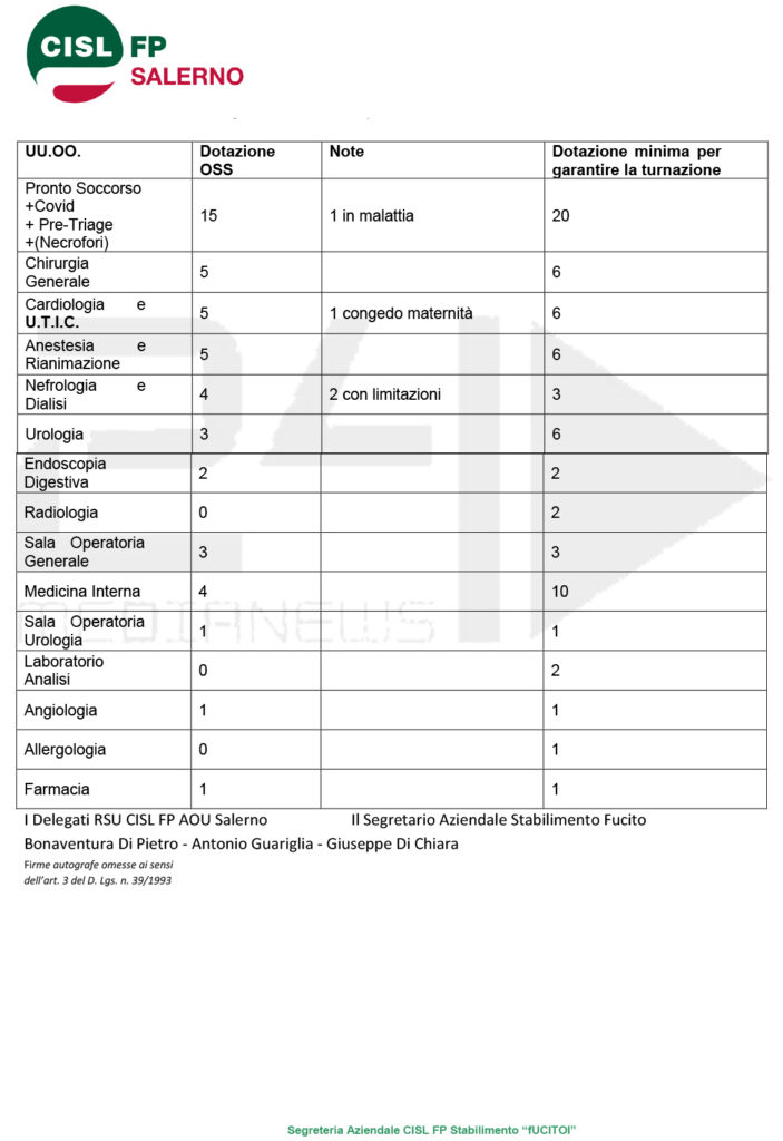 A tal proposito – Bonaventura Di Pietro, Guariglia Antonio e Giuseppe De Chiara- evidenziano che, nel mentre presso lo stabilimenti Ruggi è stata avviata una integrazione di Operatori Socio Sanitari in tutte le Unità Operative, il cui potenziamento dell’organico ha determinato la possibilità di attivazione dei cosiddetti “turni in quinta” sulle 24 ore lavorative, tale riorganizzazione dei servizi non è stata ancora messa in campo presso lo stabilimento di Mercato San Severino.