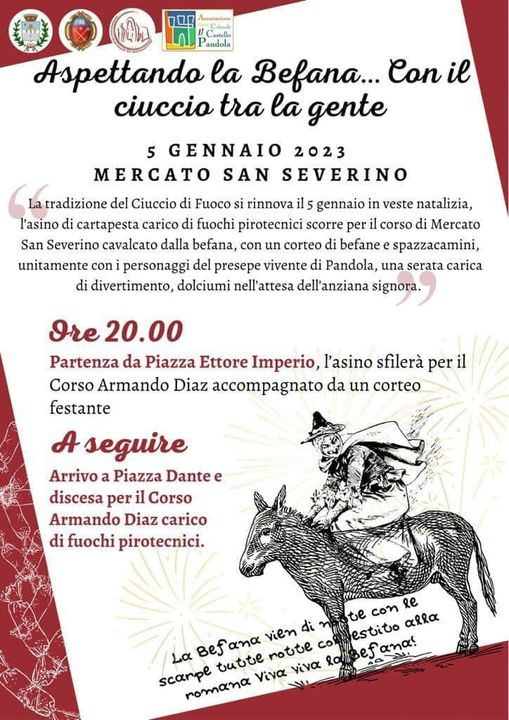 Sarà, infatti, la vecchietta tanto amata dai bambini a salire in sella all’asino di cartapesta carico di fuochi pirotecnici per sfilare in corteo lungo Corso Diaz accompagnata da tante befane, spazzacamini, personaggi dello storico presepe vivente di Pandola.
