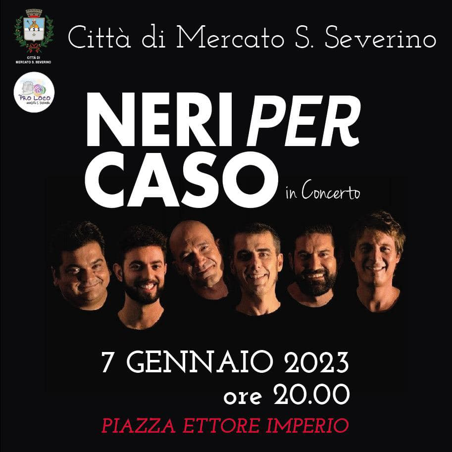 7 GENNAIO. Chiusura della tre-giorni e del lungo “Neri per Caso” affidata al concerto dal vivo dei “Neri per Caso”. Il gruppo salernitano reso famoso dall’inconfondibile sound a cappella, ripercorrerà in piazza E. Imperio, a partire dalle ore 20, i successi della loro carriera artistica insieme ai brani più recenti.