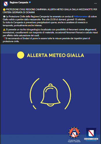 La Protezione civile della Regione Campania ha emanato un avviso di allerta meteo di colore giallo valido a partire dalla mezzanotte fino alle 23.59 di domani, giovedì 13 ottobre.
