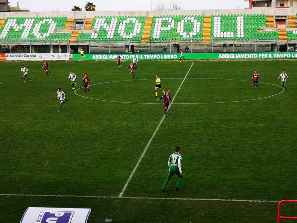 Meglio il Monopoli nei primi 45 minuti in cui comunque non si è visto un grandissimo calcio da una parte e dall’altra. Sul finale fioccano occasioni da rete per i biancoverdi, prima con Fella e poi con Donnarumma. Ripresa iniziata in modo simile, con grande tentativo in acrobazia da parte del solito Fella. Pugliesi pericolosi anche con Salvemini. Palla elegantissima che si staglia a giro ad un millimetro dall’incrocio. Fuori causa Crispino. A svegliare la Casertana, con un crescendo che nel finale porterà al rigore, è stata a metà ripresa l’iniziativa di D’Angelo, Azione personale del centrocampista della Casertana che prova ad involarsi sulla trequarti in dribbling ed esplode un piatto destro in equilibrio precario, palla troppo alta da ottima posizione. Altra occasione pugliese. Conclusione da buona posizione del centrocampista, servito da un cross basso e teso da Hadziosmanovic. Dal dischetto Tsonev colpisce in mischia Varesanovic. Poi l’ingresso di Corado per Starita, mossa che alla fine s’è rivelata decisiva e vincente. Casertana che sale a quota 38, tre punti pesantissimi conquistati in trasferta nel momento cruciale della stagione.