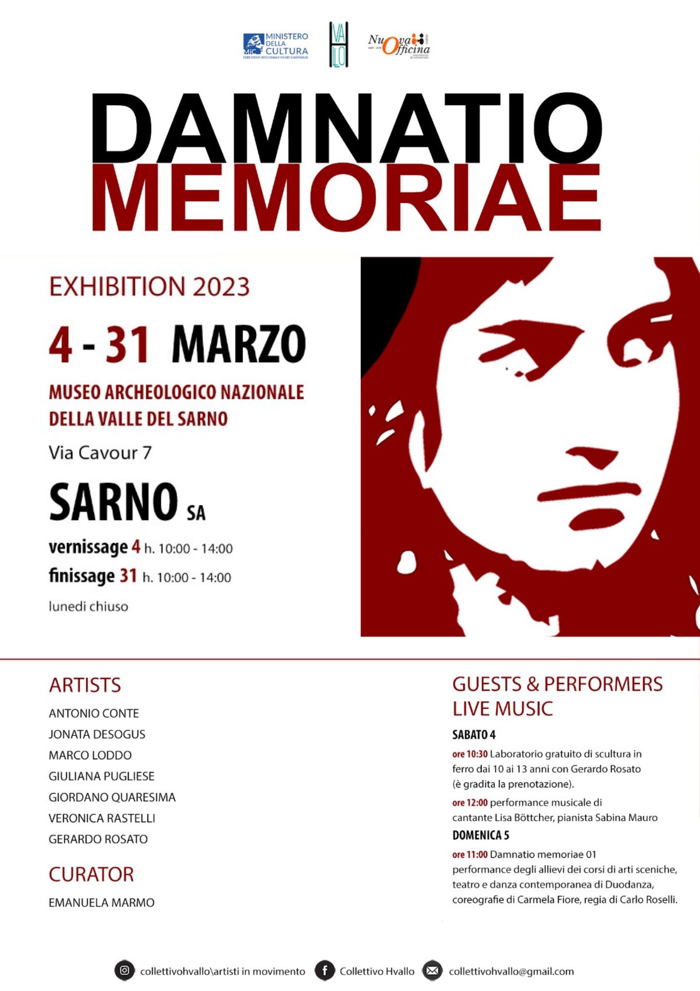 Sabato 4 marzo 2023 alle 10.00, al Museo archeologico nazionale della Valle del Sarno si inaugura la mostra di arte contemporanea “Damnatio Memoriae”, a cura di Emanuela Marmo, organizzata in collaborazione con il Collettivo Artistico Hvallo, che riunisce quattordici artisti che operano in Italia e all’estero, e l’Associazione Nuova Officina.