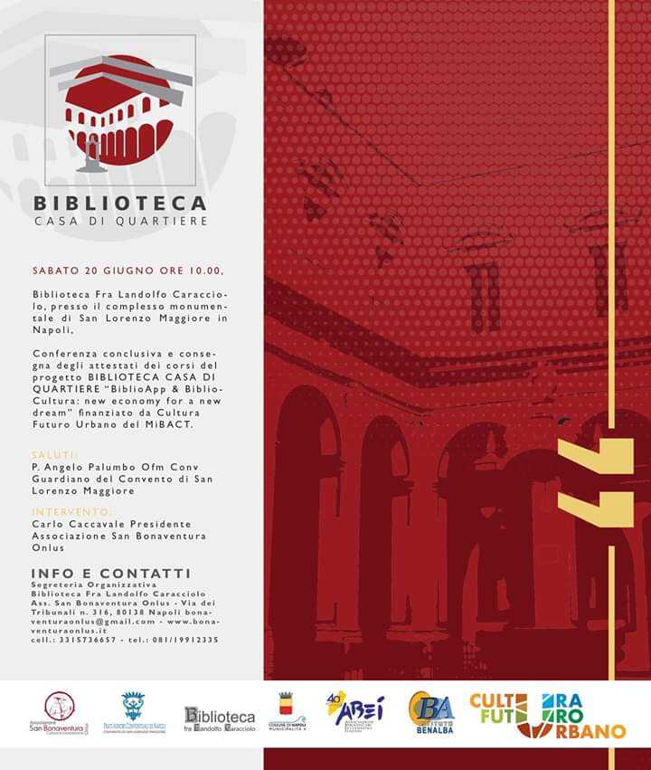Sabato 20 giugno alle ore 10.00 l’associazione San Bonaventura Onlus presenta la conferenza finale del progetto Biblioteca Casa Quartiere che si terrà presso la Biblioteca Fra Landolfo Caracciolo nel Complesso di San Lorenzo Maggiore.