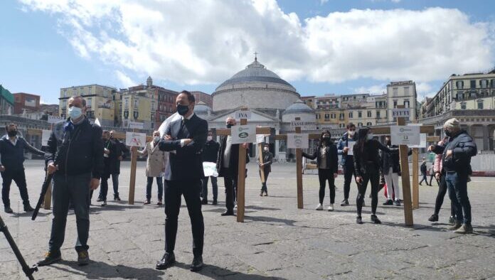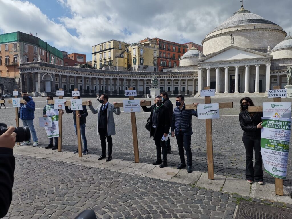 Si è tenuta questa mattina a Napoli la manifestazione di protesta organizzata da Confesercenti Campania: in piazza del Plebiscito sono state esposte 15 croci (portate sulle spalle dai vari rappresentanti delle categorie commerciali), che rappresentano 15 costi insostenibili per le aziende campane. Su ogni croce era riportato l’afflizione economica insopportabile per gli esercenti della nostra regione: dall’Iva alle pressioni dell’Agenzia delle Entrate, dall’Irap, Imu,Tari, Ires, Irpef alle cartelle esattoriali, dai fitti e dalle utenze alle altre gravose tasse, dalle esposizioni con le banche allo spettro della malavita. Sono state anche raccolte oltre 5000 firme per la petizione per “far ripartire le imprese”, consegnata al Prefetto di Napoli (e sottoscrivibile sul sito www.confesercenti.it).
