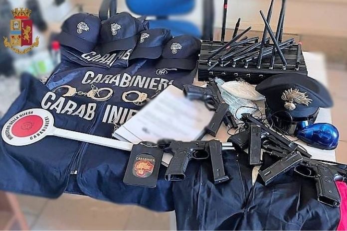 I poliziotti, all’interno delle vetture, hanno trovato 3 pistole Beretta modello 98fs e una pistola semiautomatica Tanfoglio calibro 9×21, tutte con matricola abrasa, 60 cartucce, un taser, un lampeggiante, un apparato sirena bitonale, un jammer, due paia di manette, tre decreti di perquisizione domiciliare falsi, 4 pettorine, 5 mascherine, un portatessera da collo e una paletta segnaletica riportanti lo stemma contraffatto dell’Arma dei Carabinieri nonché alcune parti di uniformi dei Carabinieri. R.D.A., 35enne di Casandrino, è stato arrestato per detenzione di armi clandestine e relativo munizionamento e ricettazione.