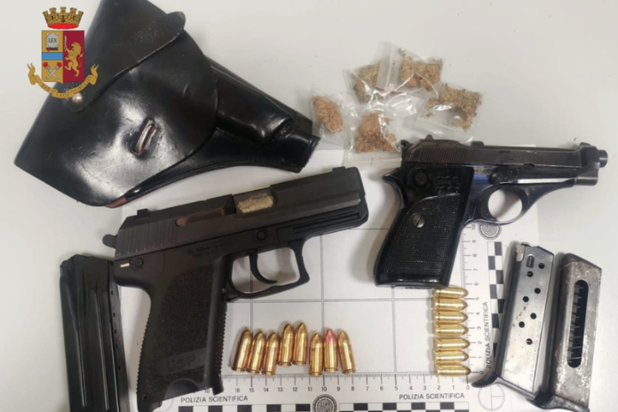 Ieri sera gli agenti del Commissariato di Afragola e del Reparto Prevenzione Crimine Campania hanno effettuato un controllo presso l’abitazione di un uomo in via Salvator Rosa a Cardito dove hanno rinvenuto, dietro la cassettiera della camera da letto, una pistola “Usp Compact” cal. 9×19 con 8 cartucce, una pistola “Beretta” con 7 cartucce, entrambe con matricola abrasa, e 5 bustine contenenti 4,5 grammi circa di marijuana.