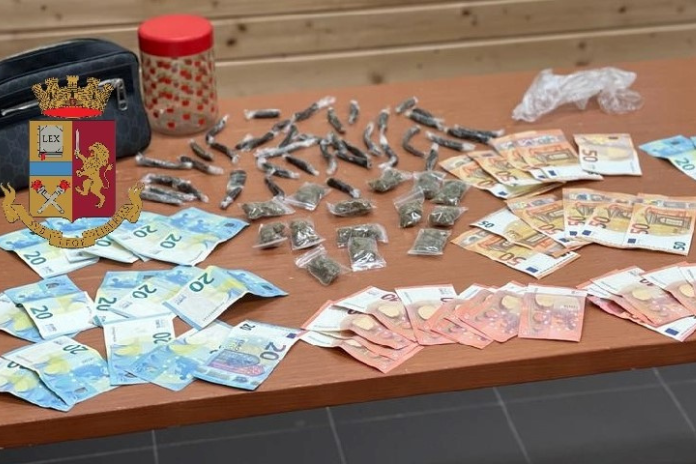 I poliziotti hanno raggiunto e bloccato lo spacciatore trovandolo in possesso di una stecca di hashish, una bustina contenente marijuana e 1270 euro; inoltre, nella busta, hanno rinvenuto un barattolo in vetro con 39 stecche di hashish del peso di circa 145 grammi e 13 bustine contenenti circa 26 grammi di marijuana.