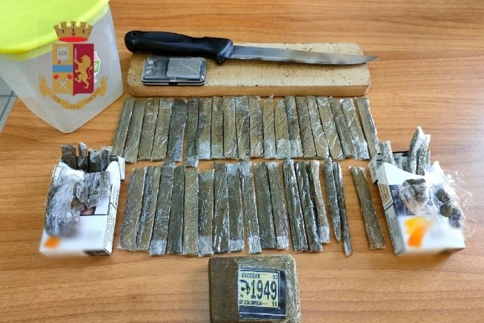 I poliziotti, con il supporto dell’Unità Cinofila dell’Ufficio Prevenzione Generale, hanno rinvenuto, all’interno di una busta nascosta dietro un mobile nella sala da pranzo, 37 stecche, 1 tavoletta e 16 pezzetti di hashish per circa 281 grammi, un bilancino di precisione, un tagliere e un coltello con la lama di 18 cm.