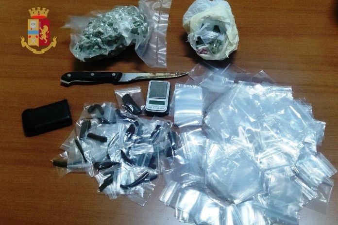 Inoltre, gli agenti hanno effettuato un controllo nell’appartamento dell’uomo dove hanno rinvenuto 20 bustine contenenti 22 grammi circa di marijuana, una busta con 110 grammi circa della stessa sostanza, 33 bustine con 80 grammi circa di hashish, un bilancino di precisione e diverso materiale per il confezionamento della droga.