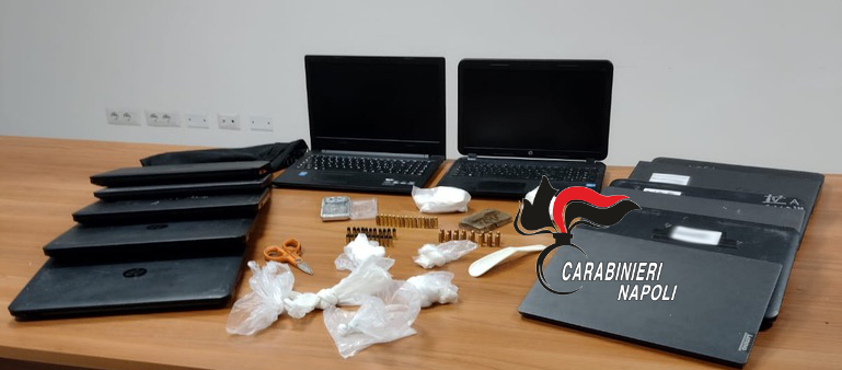 Trovati, nel vano contatori in un’area comune, 13 computer portatili di diverse marche verosimilmente rubati e 11 munizioni calibro 380.