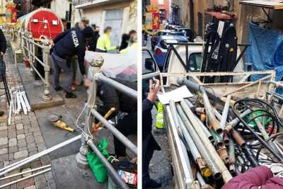 Gli agenti del Commissariato Montecalvario e della Polizia Locale, con il supporto di personale della Napoli Servizi, nel corso di un servizio effettuato nella mattinata di giovedì, volto ad assicurare e ripristinare la legalità e la libera circolazione sulla pubblica via, hanno rimosso 45 paletti in metallo e 3 metri circa di catena abusivamente installati lungo vico Paradiso, vico Campanile al Consiglio, vico Trucco, vico Pergolella Morbillo e vico Grotta Mastrodatti. I poliziotti, inoltre, in largo Baracche hanno sanzionato un uomo e una donna che avevano realizzato un gazebo nel quale avevano collocato due calcio balilla assicurandoli con una catena.
