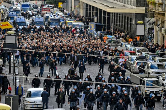 Guerriglia in pieno centro a Napoli dove si sono verificati scontri tra i tifosi dell’Eintracht e decine di persone con il volto coperto da caschi. 600 tifosi dell’Eintracht, giunti in città nonostante il divieto (per i residenti a Francoforte) di assistere al match,