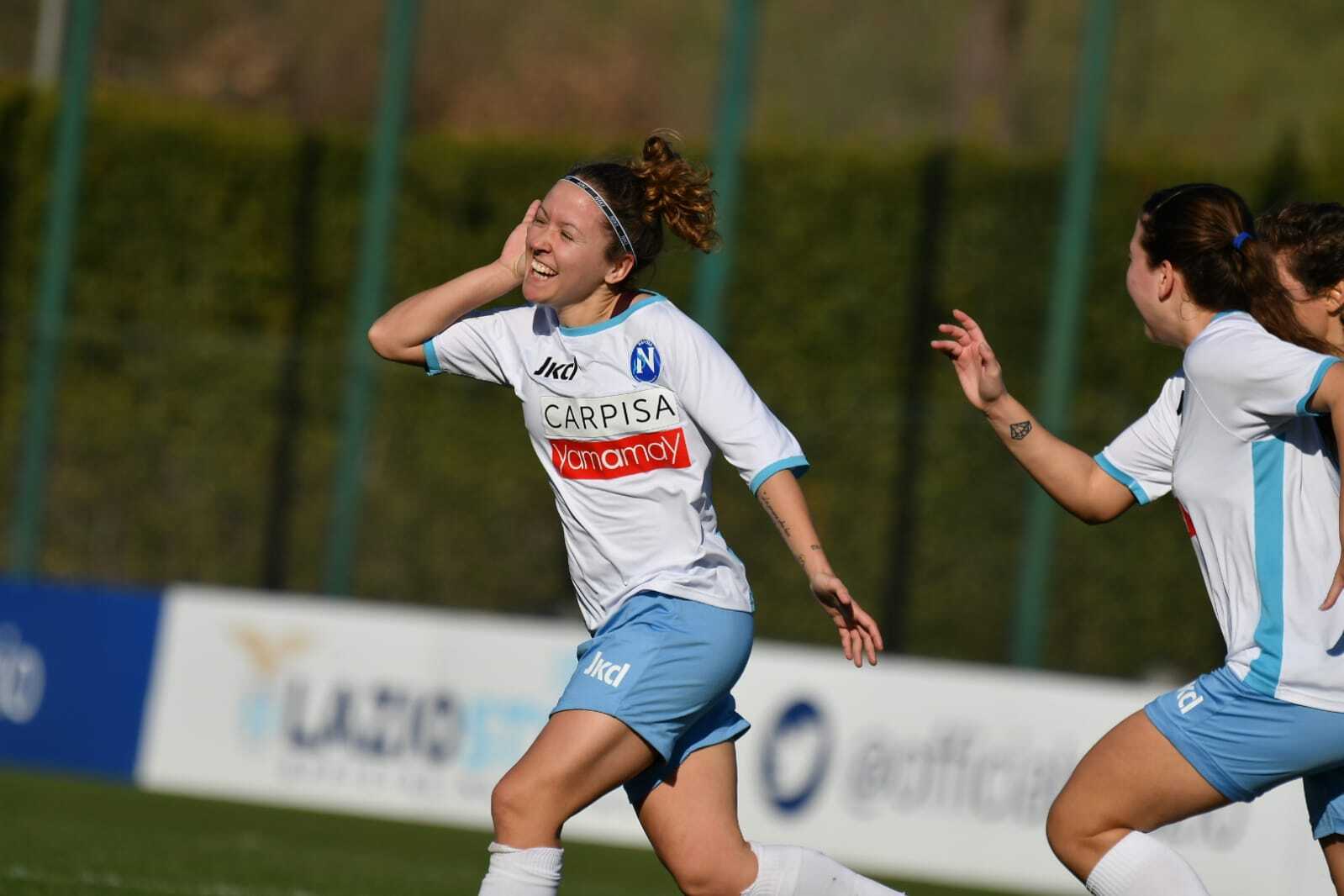 Una impresa, l’ennesima, che certifica la forza del Napoli Femminile, capace di sbancare il centro sportivo di Formello rimontando la Lazio. Finisce 1-2 a Roma, festeggiano i cento tifosi azzurri arrivati da Napoli e dalla Capitale. Adesso la formazione del presidente Carlino ha quattro punti di vantaggio sul San Marino e cinque proprio sulla Lazio ma, soprattutto, ha portato via sei punti dai due scontri diretti esterni. Se sul Monte Titano il Napoli era partito forte, stavolta è andato sotto al primo tiro in porta della Lazio, dopo 13’, con Pezzotti. La gara in salita ha esaltato le caratteristiche di reazione delle partenopee, capaci già nella prima frazione di ribaltare il risultato con le “gemelle del gol” Gelmetti e Chatzinikolau (rispettivamente nove e dieci reti in campionato). Il pareggio lo ha siglato la trequartista ex Verona e Chievo mentre la rete della vittoria è stata realizzata dalla greca su calcio di rigore (ha calciato lei dopo che Nencioni aveva fallito le ultime due conclusioni da dischetto). Nella ripresa, il Napoli ha controllato le sfuriate avversarie, Marino con i cambi è riuscito ad addormentare il ritmo e alla fine ha alzato le braccia al cielo insieme al suo staff. Soddisfazione meritata come meritato è il primo posto in classifica: “È una vittoria dello staff, del lavoro fatto da tutti i collaboratori per rimettere in piedi ragazze come Di Marino, Gelmetti e Chatzinikolau che si erano allenate poco in settimana – spiega mister Marino -. Inoltre, sono soddisfatto di come abbiamo interpretato la gara sia dopo lo svantaggio che nei secondi 45’. Stiamo crescendo come mentalità e raccogliendo firme frutti del lavoro quotidiano che è tattico, fisico e mentale. Adesso, guai ad accontentarci perché i pericoli sono dietro l’angolo anche se la nostra forza sta emergendo”.
