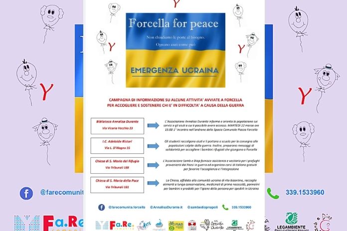 Le associazioni di “Fa.Re. Comunità” – Famiglie Responsabii per una Comunità Educante a Forcella si sono organizzate per promuovere in maniera integrata i servizi e gli aiuti che gli abitanti di Forcella sono chiamati ad offrire in favore delle popolazioni colpite dalla guerra tra Russia ed Ucraina.