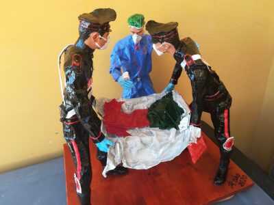 Alla consegna era presenta anche lo scultore, un militare dell’Arma cultore della carta pesta salentina, l’Appuntato Scelto Q.S. Alessandro Leo che ha detto : “Ho realizzato questo trittico in carta pesta leccese, un materiale povero ma di grande forza strutturale. I due carabinieri rappresentati trasportano l’Italia e la affidano agli infermieri. Uno dei carabinieri incontra lo sguardo dell’infermiere come a chiedere se ce la farà. La risposta è semplice ma carica di significato: una pacca rassicurante sulla spalla.”