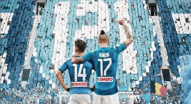 Napoli, Mertens e Hamsik abbracciati, davanti al numero 121