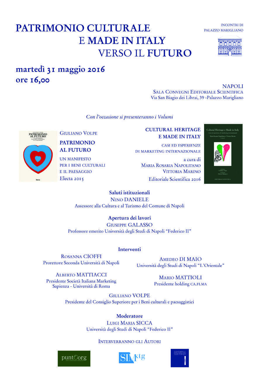 Martedì 31 maggio nell’ambito della rassegna “Incontri di Palazzo Marigliano”, alle ore 16 presso la sala Convegni dell’Editoriale Scientifica a Napoli, saranno presentati i volumi “Cultural Heritage e Made in Italy. Casi ed Esperienze di Marketing Internazionale” (a cura di Maria Rosaria Napolitano e Vittoria Marino) e “Patrimonio al Futuro” (a cura di Giuliano Volpe). L’evento sarà l’occasione per un dibattito tra studiosi, rappresentanti di Enti, Istituzioni e mondo imprenditoriale sull’importanza del patrimonio culturale italiano per la valorizzazione del Made in Italy.