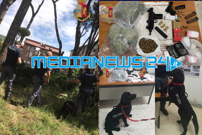 Durante l’attività i poliziotti hanno sequestrato in via Romolo e Remo, occultati nell’area verde di un complesso di palazzine, una pistola completa di 7 cartucce, una pistola mitragliatrice con 18 cartucce, tre buste contenenti 2 kg circa di marijuana, 93 cartucce di diverso calibro, due caricatori, un bilancino e diverso materiale per il confezionamento della droga.