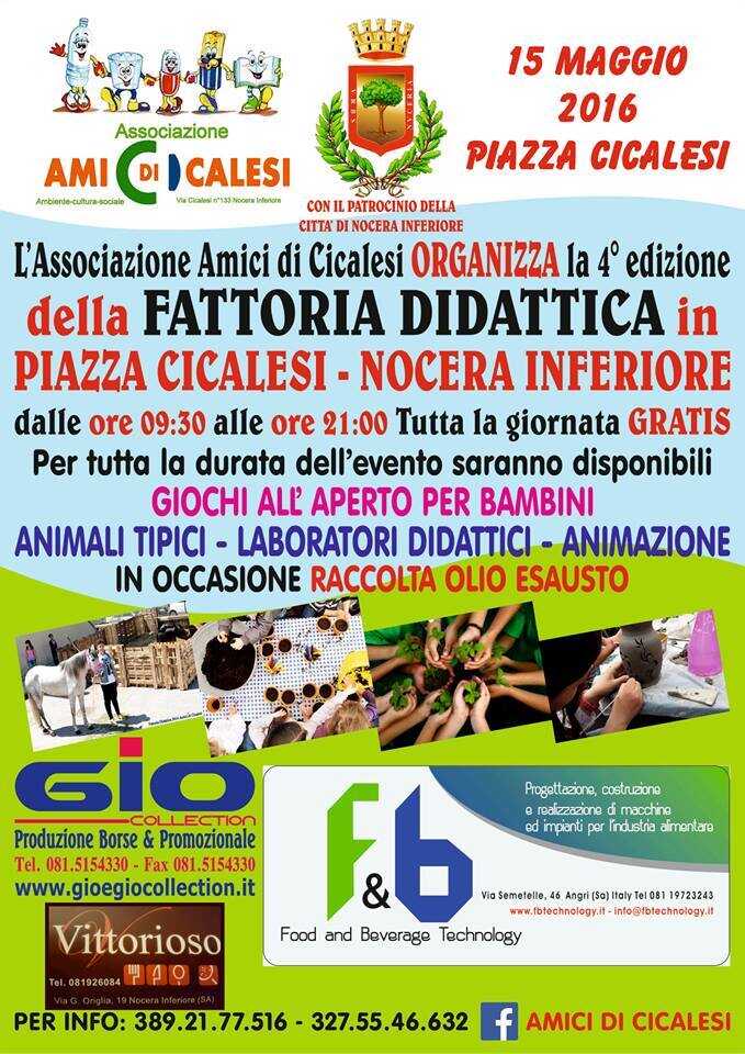 Si svolgerà il 15 maggio in Piazza Cicalesi, con il patrocinio del Comune di Nocera Inferiore, la 4° edizione della Fattoria Didattica in Città, evento creato dall’Associazione Amici di Cicalesi. L’evento, completamente gratuito, è per i bambini, per le famiglie e per tutti i cittadini che vogliono vivere una domenica diversa al contatto con la natura e gli animali, divertendosi nella propria città. I bambini potranno partecipare a coinvolgenti laboratori didattici.