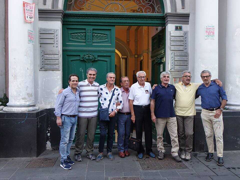 Davanti alla sede della Nocerina di quarant’anni fa, una porzione di seconda B conquistata. Lio Faiella, assieme a Gino D’Angelo all’epoca espressione di vertice del tifo sano e intelligente. L’appassionato di sempre Antonio Vicidomini. La coppia del gol composta da Stanislao “Enzo” Bozzi, cresciuto nel Torino, e da Oliviero Garlini, quello che faceva il rincalzo di lusso nell’Inter del Trap e l’eroe con Schachner nel Cesena di Bagnoli. Il bravissimo Riccardo Caruso assieme a loro e ad Adriano Grava, non il padre di Gianluca (non c’interessa qui il Napoli) ma il componente con Calcagni di uno spietato tandem di difensori centrali, anzi stopper e libero, di centrali a quel tempo parlava in Italia solo Vinicio, c’è Nicola Labrocca, suo fratello era più famoso però lui era bravo lo stesso. Ma io già da allora facevo il tifo per Luciano Bove visibile in foto, fratello del Peppe noto cameraman,attivista grillino e componente della Protezione Civile. Luciano all’epoca terzo portiere e guardiano dei pali della Primavera. Successivamente preparatore atletico nella Calabria patria acquisita, preparatore di calcio, basket e rugby. Beato il paese calcistico che non ha bisogno di eroi ma di gente che fa il dovere al massimo delle forze. Prendo la corona del rosario rossonero, anche se questa cosa sa di un passato che mai potrà tornare: Pelosin, Cornaro, Pigozzi, Spada, Grava, Calcagni, Bozzi, Porcari, Chiancone (Robè ma stai sempre in mezzo?), Caruso e Garlini. Ma anche Garzelli, Manzi, Giovanetti, Pecoraro buonanima, Barrella, Antignani, Labrocca, Esposito e il già citato Bove. E come non citare gli altri fuori dal campo: Orsini, Giorgi, Corni, Fasolino, “Bombon”, il grande Corni, Lamanna, D’Alessandro, Padovano e Siniscalchi. I ricordi sono una parte di noi, continuo a credere che siano una parte da mettere da parte. Nel calcio, la partita più importante è sempre la prossima. Vorrei dedicare questo pezzo a Rino Del Monte, all’epoca un ragazzino: non chiedetemi il perchè.