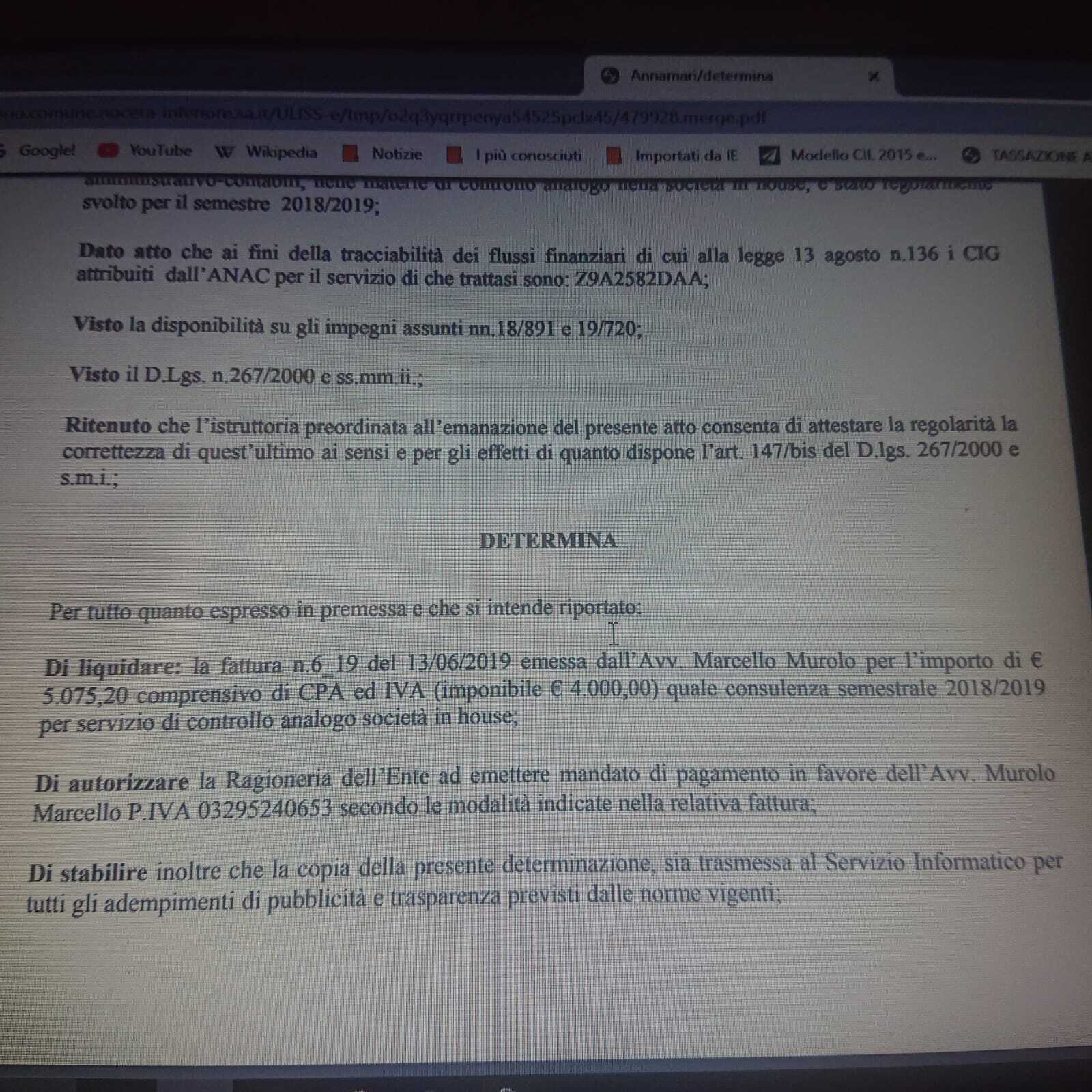 Un complicato incrocio di destini amministrativi. La determina è del Comune di Nocera Inferiore che paga per consulenze un avvocato di Cava de’ Tirreni, cioè Marcello Murolo. Le capacità giuridiche di Murolo, però, vengono sistematiche demolite da Servalli sindaco PD di Cava de’ Tirreni, per una querelle che si trascina da settimana. Il paradosso diventa politico e non solo. Un consulente non stimato dal centrosinistra di Cava viene nominato dal comune di Nocera Inferiore, con colorazione civica e verniciatura di centrosinistra, come consulente. Murolo magari si candiderà a sindaco Cava per il centrodestra. Oppure, non accadrà, la politica è strana, riserva sempre sorprese. Però, l’incrocio, mette imbarazzo, anche se un’amministrazione sceglie i consulenti che vuole, anzi a volte è meglio evitare di scegliere tra gli amici politici, per evitare critiche ancora più accese e ardite.
