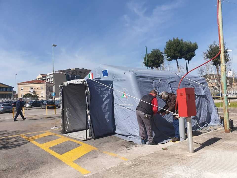 In mattinata era venuta giù all’improvviso la tenda pre-triage montata ieri mattina all’Ospedale Umberto I. Venuta giù per cause tecniche, dovute ad un compressore non funzionante. Nel giro di poche ore, rieccola in piedi, la Protezione Civile ha recuperato alla svelta un nuovo compressore in quel di Maddaloni.