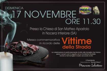 Sulla scia degli scorsi anni, si rinnova, anche per il 2019, l’appuntamento con la Giornata Mondiale ONU del Ricordo delle Vittime della Strada, in programma la terza domenica di novembre. “Le strade raccontano storie. Perché siano a lieto fine, miglioriamo la sicurezza stradale”, questo il messaggio che giunge dall’Associazione Italiana Familiari e Vittime della Strada ONLUS, da sempre impegnata nella sensibilizzazione su tale tema, auspicando un intervento concreto e fattivo da parte delle istituzioni. Come riportato sul sito dell’associazione con sede a Roma, in otto anni (2011-2019) il numero delle vittime è diminuito solo del – 19,2 % (dati AciIstat), addirittura si sottolinea come, nel 2018, il numero dei morti non ha registrato significative riduzioni, con 3.326 vittime, 9 al giorno, mentre il numero dei feriti gravi è aumentato con 18.614 con invalidità permanenti. “Sono dati che chiamano in causa la responsabilità delle istituzioni, dimostrando che la prevenzione non è reale priorità dello Stato: le istituzioni non si sono poste in tempo il problema dell’obiettivo da raggiungere e non hanno definito adeguate strategie”, queste le parole della presidente di AIFVS Onlus, dott.ssa Giuseppa Cassaniti. Sulla base di tale opera di prevenzione, l’Associazione “Social – Disco” aderisce alla Giornata, organizzando, nuovamente, una messa commemorativa in ricordo di tutti coloro che hanno perso la vita in seguito ad un drammatico incidente stradale. L’appuntamento è per domenica 17 novembre, alle ore 11,30, presso la Chiesa di San Matteo Apostolo in Nocera Inferiore, affinché si possano risvegliare le coscienze di tutti, facendo memoria di coloro che probabilmente non hanno ancora ottenuto una degna giustizia. “Per questa nuova occasione invito, in maniera sentita, tutte le famiglie che hanno perso i propri cari in seguito ad un incidente stradale. Anche a tali famiglie il nostro accorato invito”, con queste parole il presidente della “discoteca della prevenzione”, Maurizio Schettino, estende l’invito è esteso ai parenti, amici e conoscenti delle vittime, oltre alla cittadinanza dell’intero comprensorio, per un momento di partecipazione, riflessione e comprensione che non resti, però, relegato solo a questa giornata.