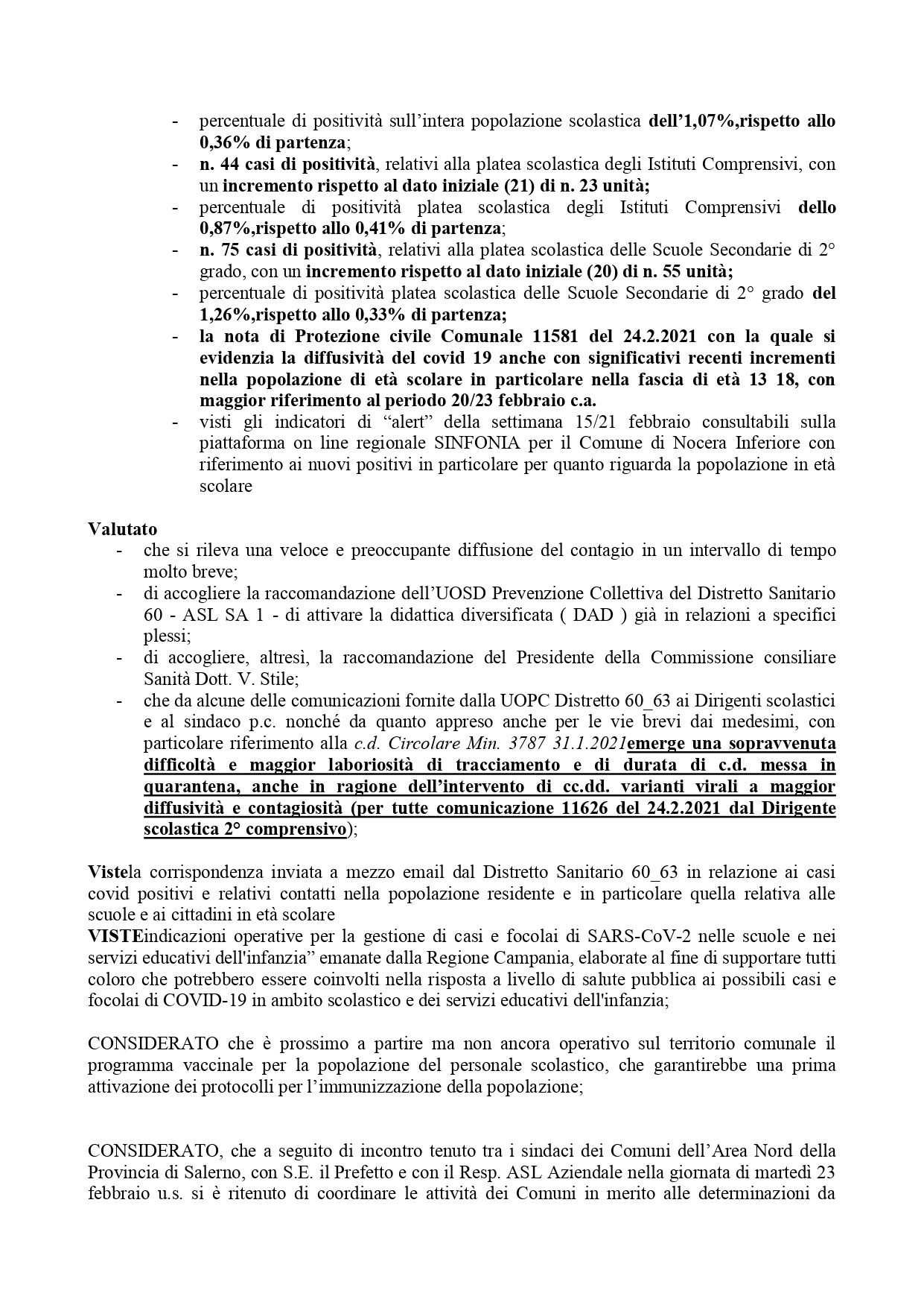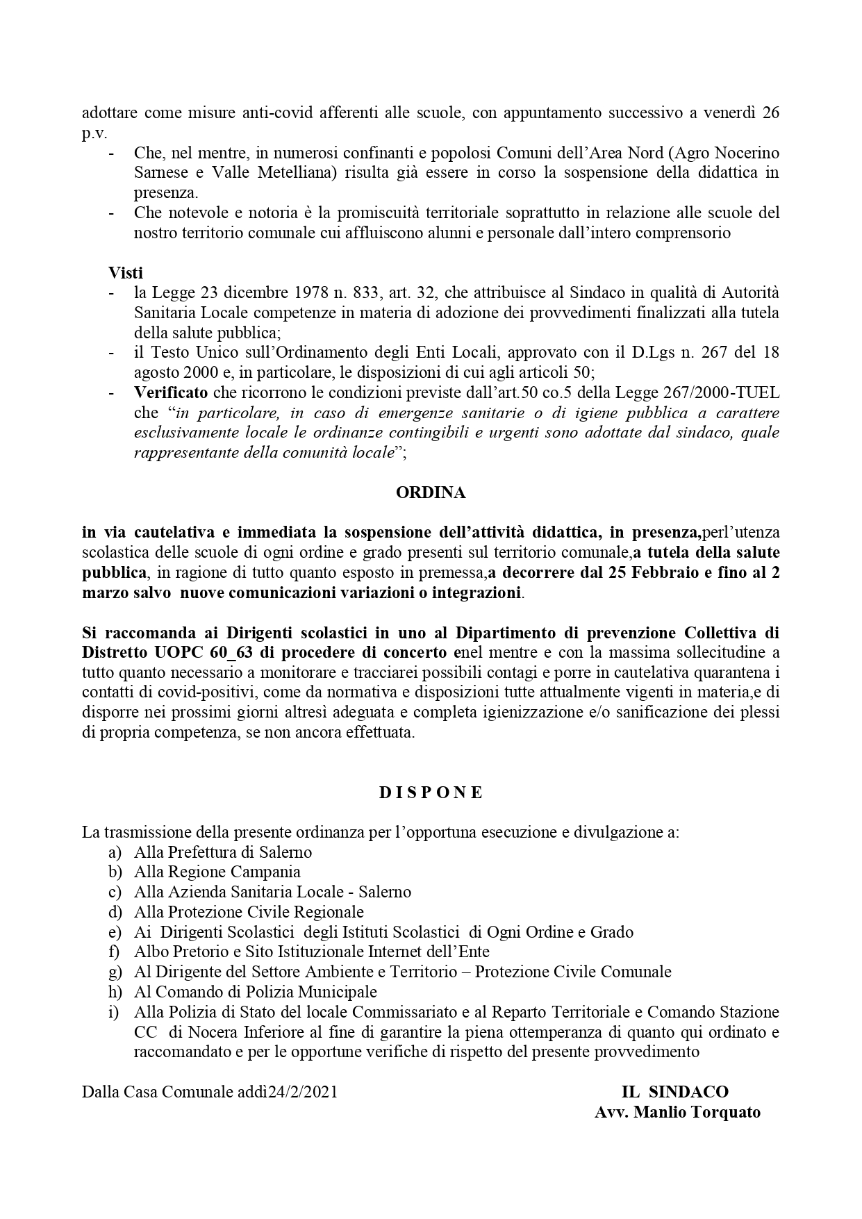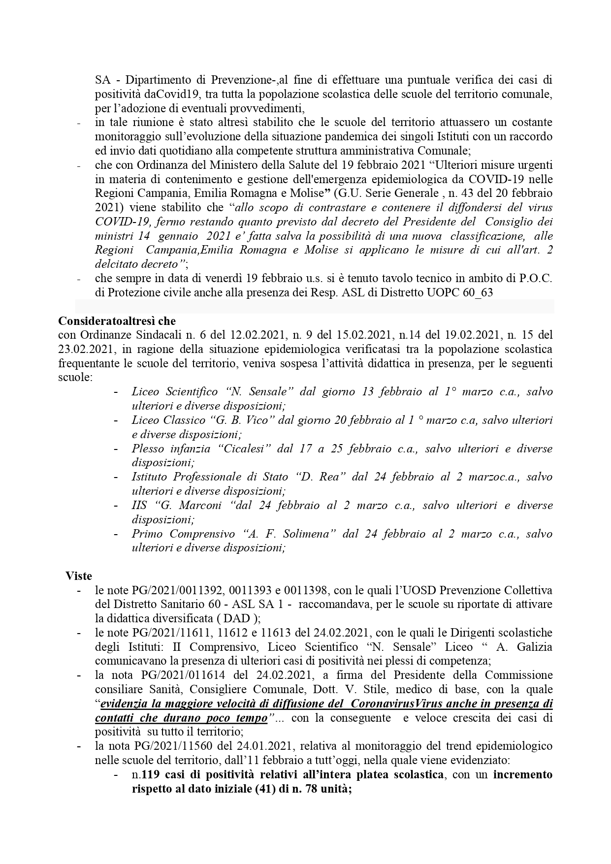 Di seguito l’ordinanza n.16 del 24.02.2021 che dispone in via cautelativa e immediata la sospensione dell’attività didattica in presenza, per l’utenza scolastica delle scuole di ogni ordine e grado presenti sul territorio comunale, a tutela della salute pubblica, a decorrere dal 25 Febbraio e fino al 2 marzo.