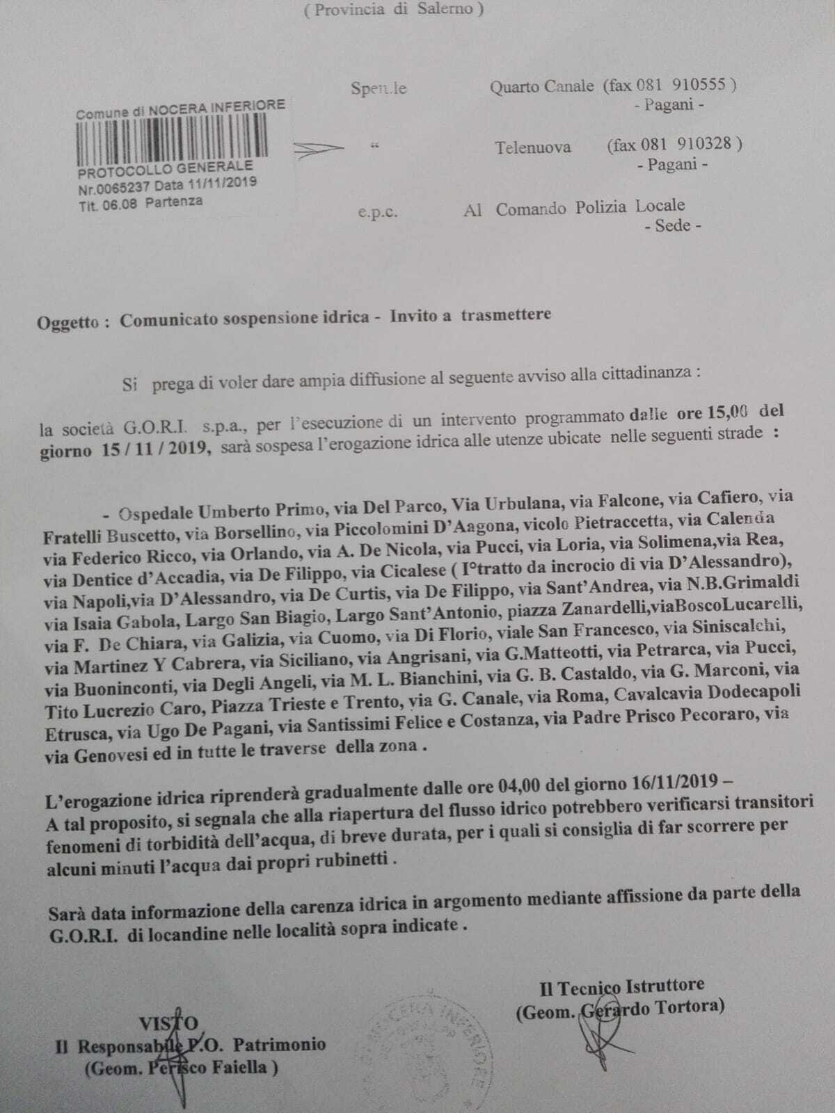 L’amministrazione comunale ha dato ufficialità a quel che si sapeva già da giorni, ovvero la chiusura dei rubinetti in quasi tutta la città per venerdì 15 a causa di lavori GORI.