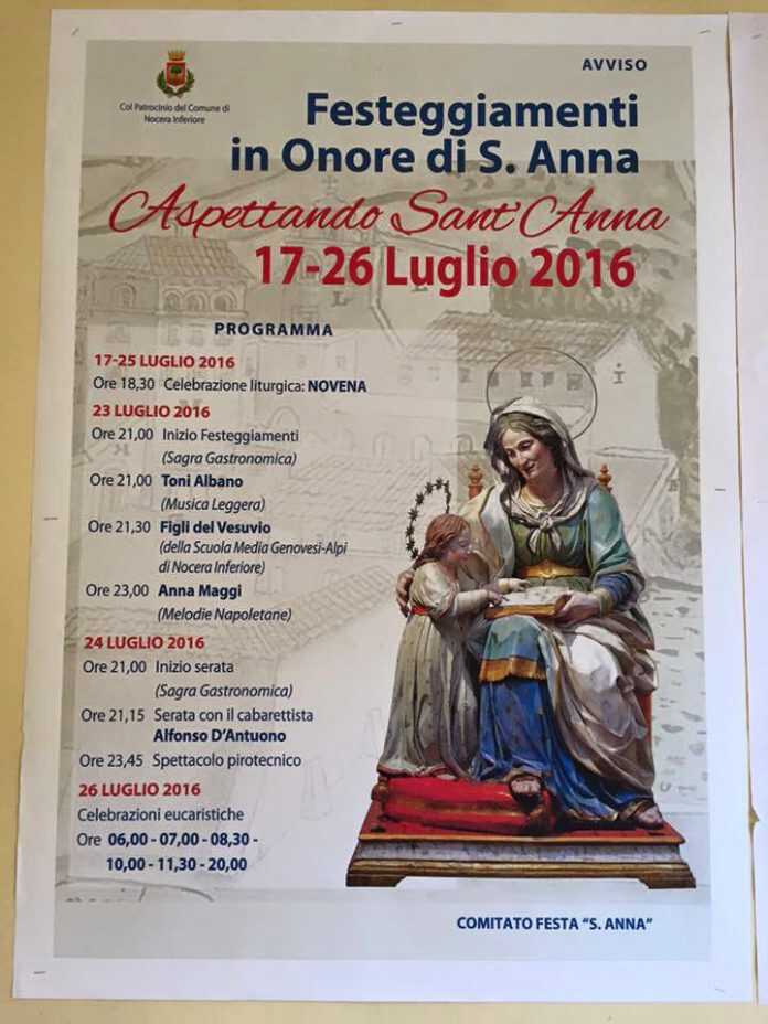 Con l’appuntamento di questa sera alle 20.30 parte il mese dedicato a Sant’Anna. Si comincia con la benedizione e l’alzata del quadro. Primo dei tanti appuntamenti organizzati dal Comitato Sant’Anna. Devozione notevole in zona, grazie al Monastero delle Suore Domenicane, ed in grado di estendersi all’intera città. Insomma dopo San Prisco e Santa Rita a maggio, Sant’ Antonio a giugno, ecco la Santa che per calendario si festeggia il 26 luglio ma che riesce ad esser sempre presente nelle preghiere di nocerini e non.