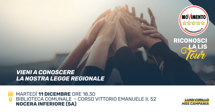 Domani, Martedi 11 dicembre, alle 18.30 presso la Biblioteca Comunale di Nocera Inferiore, ci sarà un incontro sulla “Lis”, la Lingua dei segni, con il Consigliere regionale del Movimento 5 Stelle Luigi Cirillo. La Lis è una lingua utilizzata  prevalentemente dai soggetti non udenti che utilizza i segni delle mani, le espressioni del viso e i movimenti del corpo. Nel corso dell’incontro, a cui parteciperà anche il consigliere regionale Michele Cammarano, verranno illustrate anche le novità introdotte da una legge regionale di recente approvazione.
