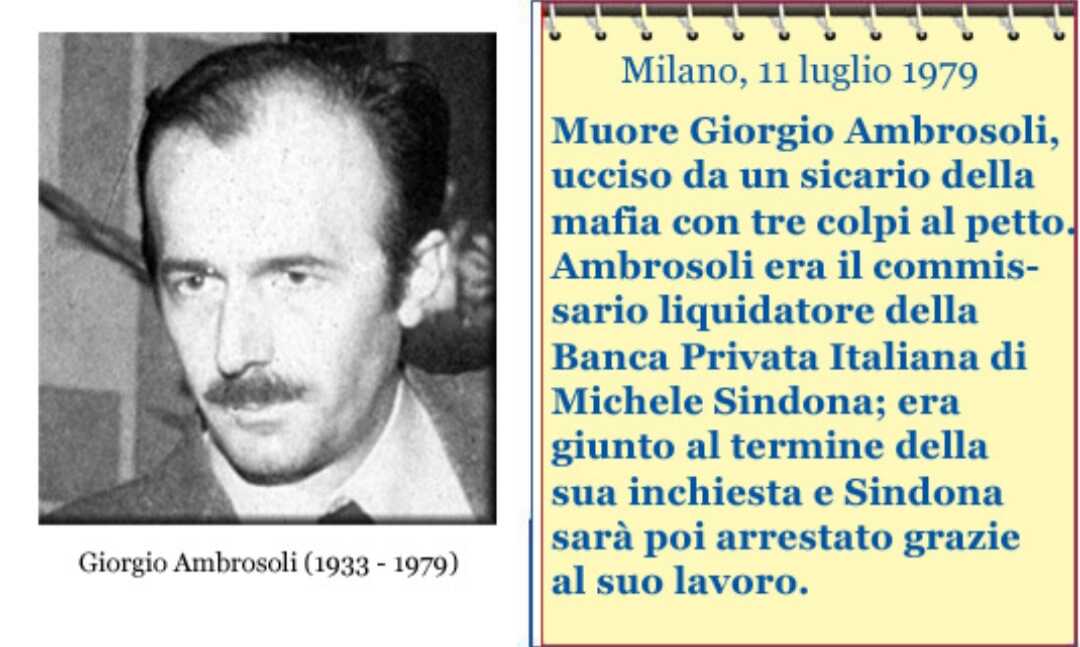 Occorre ricordare che nel 2019, precisamente l’11 luglio, a Milano, Giorgio Ambrosoli venne ucciso, dal mafioso italoamericano William Aricò, un sicario americano ingaggiato da Michele Sindona (il banchiere siciliano su cui stava indagando per il crack della Banca privata italiana), che, nel farlo, gli chiese scusa. Questo vuole dire che al 2019 sono quarant’anni da quel terribile giorno, per cui appare ancora più importante di sempre, ricordarlo con manifestazioni in cui la giustizia faccia da protagonista.