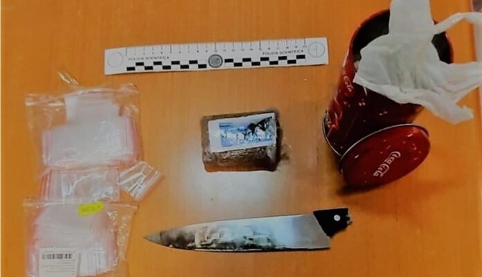 All’interno dello stesso contenitore venivano rinvenute 186 bustine in cellophane con chiusura ermetica, solitamente utilizzate per la custodia di piccole quantità di stupefacente, mentre all’interno di un cassetto dello stesso mobile, veniva rinvenuto un coltello da cucina, con il manico divelto e con lama affilatissima lunga 19,5 cm ed intrisa di sostanza solida marrone.
