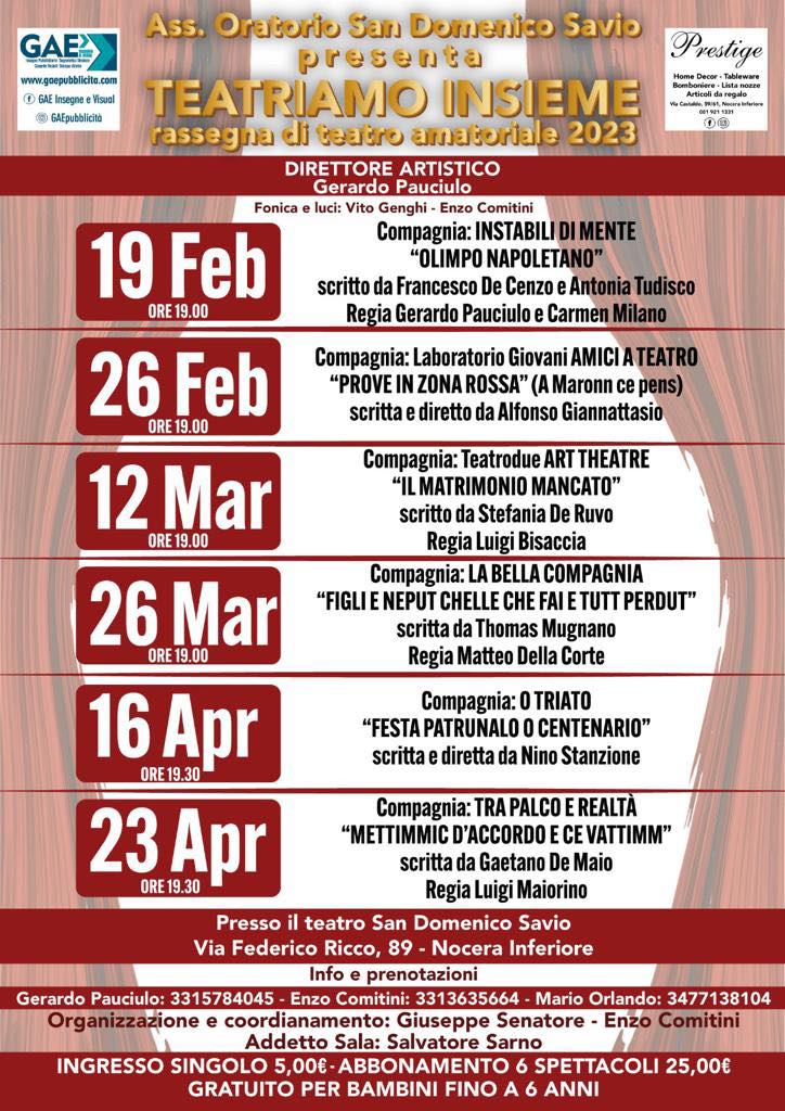 L’Associazione di promozione sociale “Oratorio San Domenico Savio”, con la preziosa collaborazione della Parrocchia San Bartolomeo Apostolo di Nocera Inferiore presenta “Teatriamo Insieme”, rassegna di teatro messa in scena al teatro dell’Oratorio San Domenico Savio in Via Federico Ricco a Nocera Inferiore (SA).