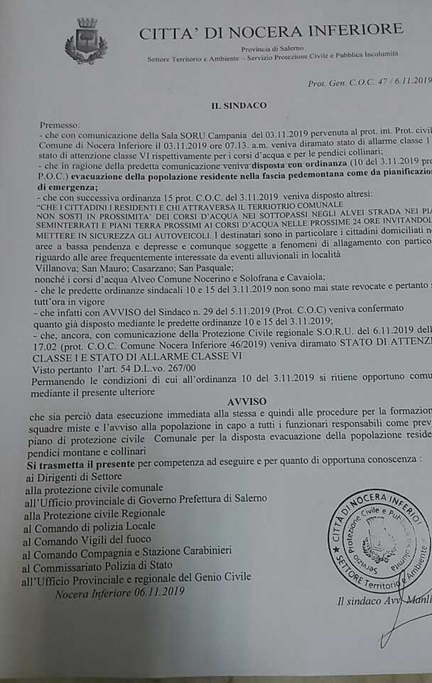 Emessa in queste ore dal primo cittadino Manlio Torquato, riguardante le zone a rischio, in particolare quelle pedemontane e in pendici collinari. Via libera alla formazione di squadre per avvertire la popolazione.