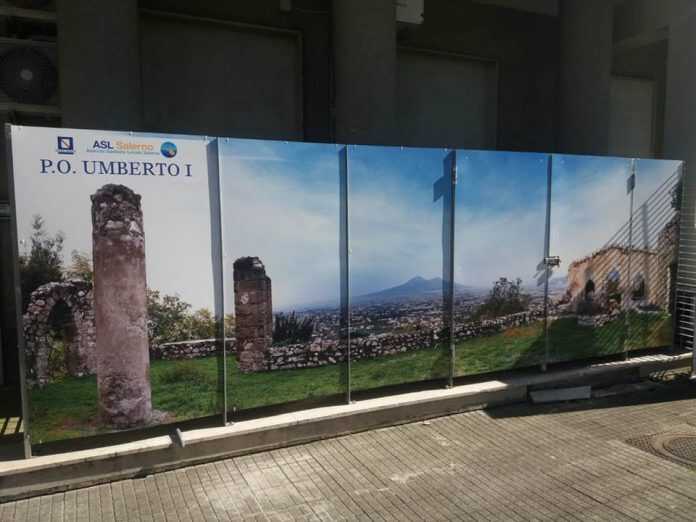La vista dell’Agro dal belvedere del nostro Castello del Parco esposto nel atrio dell’Ospedale. La novità estetica viene sottolineata con un post su Facebook del consigliere comunale Enzo Stile, presidente della Commissione Sanità