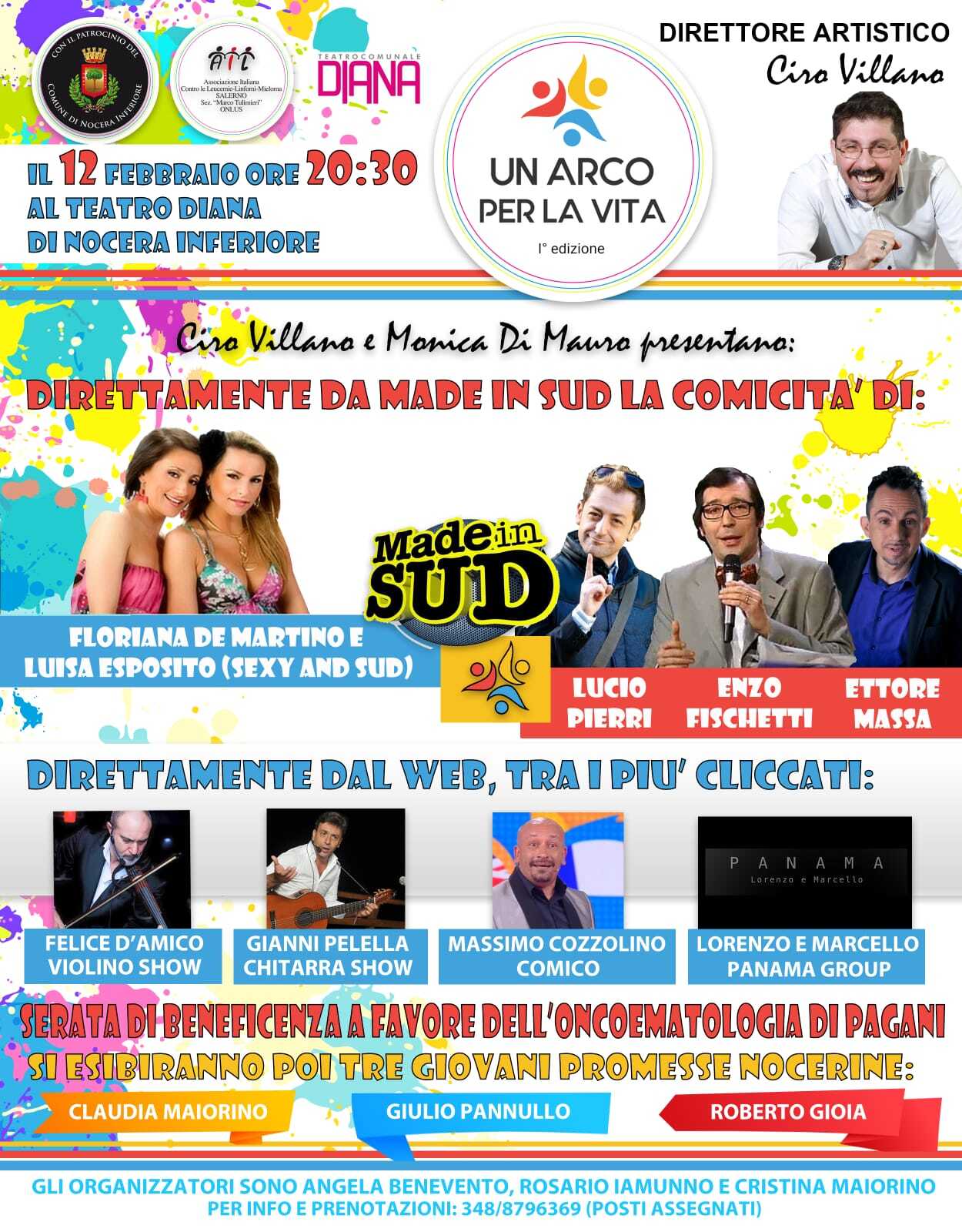 Beneficenza in favore del reparto di Oncoematologia dell’Ospedale Tortora di Pagani. L’appuntamento è fissato per il 12 febbraio al Teatro Diana- a partire dalle 20,30 – dove si esibiranno, direttamente da MADE IN SUD, i comici Pierri, Fischetti e Massa. Assieme a loro, ci saranno altri volti noti del web e talenti locali. E’ la prima edizione di Un Arco per la Vita