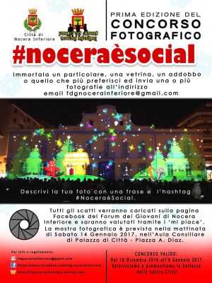 Il concorso fotografico ufficiale dell’intera programmazione degli eventi natalizi 2016/2017 – predisposta dal Servizio Istruzione, Cultura, Sport, Spettacolo e Turismo del Comune – invita a raccontare, attraverso fotografie e/o selfie, la bellezza della ‘Città di Nocera Inferiore’ proponendosi col marchio esclusivo #NoceraèSocial.